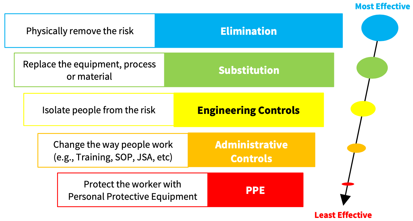 The hierarchy of controls ranges from the most effective Elimination (removing the risk), through Substitution (replacing the risk), Engineering Controls (isolating people), Administrative Controls (changing work habits), to PPE.